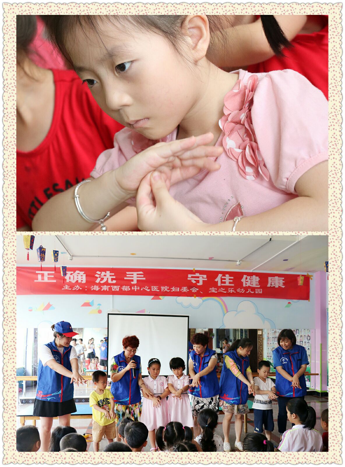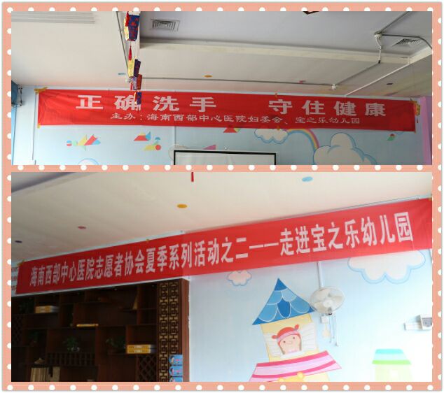 5月30日下午,炙热的高温烘烤着那大的大地,在中兴大街和信经典花园小区对面的“宝之乐幼儿园”,由海南西部中心医院妇委会组织,来自该院团委、院感办、宣传科等部门的9名志愿者积极参与的健康教育活动正在这里举行,也由此拉开海南西部中心医院志愿者协会夏季系列活动之二——走进宝之乐幼儿院活动的序幕,130多名幼儿园的小朋友们在这里第一次接受正规医疗机构人员为他们上了一堂生动活泼、别开生面的“正确洗手,守住健康”的主题教育课。